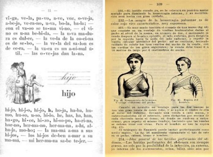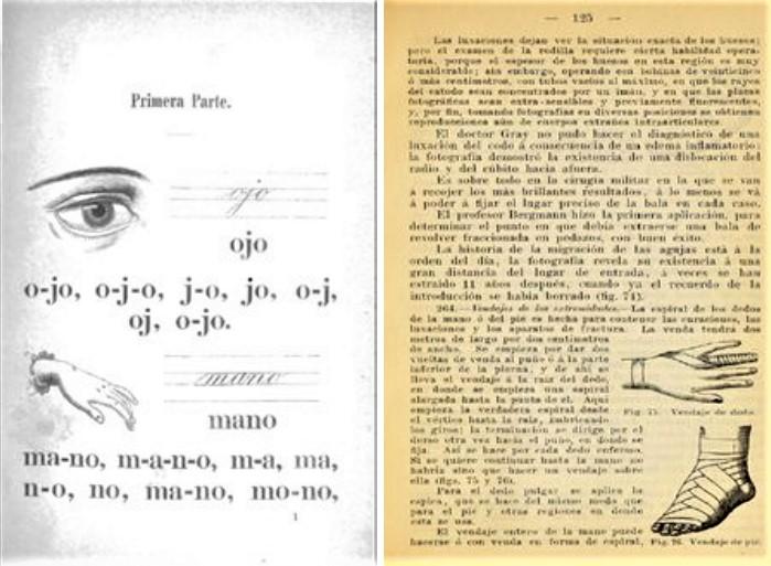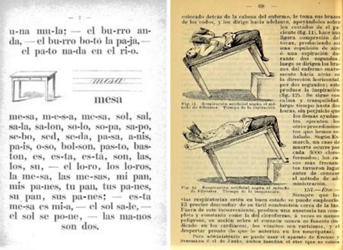 En las imágenes de Cirugía desaparecen los animales exóticos o domésticos del silabario (loro, pato, gato, perro, ratón) y aparecen figuras y rostros masculinos,