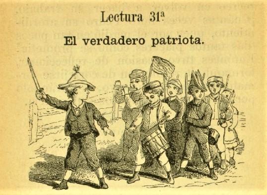 El cruce entre escolarización y militarismo, mostrado en este paralelo entre el libro de Moore y el de Matte se hace aún más patente en la ilustración de un libro de José Abelardo Nuñez, El lector américano (1881) , de la misma imprenta.
