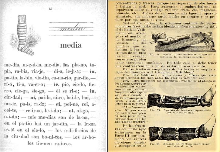 Ambas publicaciones están diseñadas conforme a una noción equivalente de la alfabetización visual, recurriendo a elementos icónicos comunes: la mano, la pierna y el pie, la mesa, la rueda y la mujer. En el silabario, la mano estilizada y aislada del cuerpo, en Cirugía, múltiples formas de vendar y amputar esa misma mano. La pierna vestida con una media del silabario pasa a estar vestida con sistemas improvisados de inmovilización (fusiles, vainas de sables, bayonetas). La mesa, deletreada en el silabario, pasa a ser una mesa de maniobras hospitalarias. Los caballos y las ruedas se vuelven instrumentos de salvataje. La mujer, que en el silabario aparece como madre, en el libro de Moore es representada mediante el recurso de la metonimia (senos: maternidad) y usando un cuidado peinado de reminiscencias helénicas, despojada de cualquier expresión de dolor (ver ejemplos en seguida).