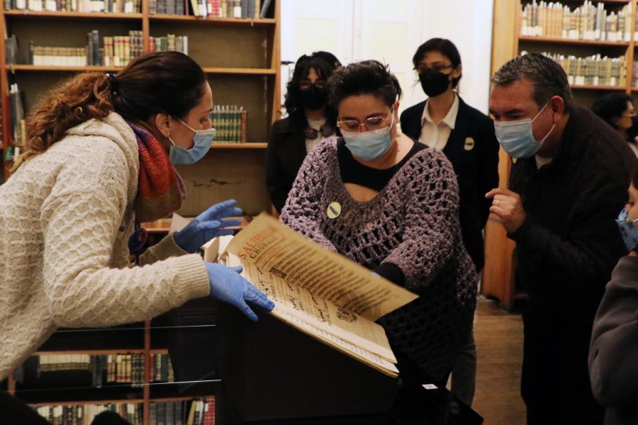La/os visitantes pudieron apreciar de cerca auténticos tesoros bibliográficos y contemplar libros hechos a mano a través de técnicas y estilos históricos, en un recorrido mediado por Elizabeth Gallegos y Pamela Tighe, integrantes del equipo de investigación que generó esta muestra temporal.